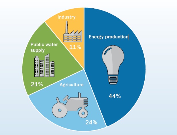 Na osnovu podataka Eurostata i Europske agencije za okoliš procjenjuje se da je 2011. godine iz termoelektrana na ugljen proizvedeno 830 TWh elektri?ne energije, iz plinskih elektrana 758 TWh i 902 TWh iz nuklearnih elektrana. Ako se u obzir uzme prosje?na potrošnja vode za proizvodnju elektri?ne energije, za plinske je elektrane iskorišteno 531 milijuna metara kubi?nih vode, za termoelektrane na ugljen 1,5 milijardi, a za nuklearne elektrane 2,4 milijardi kubi?nih metara vode. To je ukupno 4,5 milijardi kubi?nih metara vode, što je ekvivalentno prosje?noj potrošnji vode za 82 milijuna ku?anstava. |
