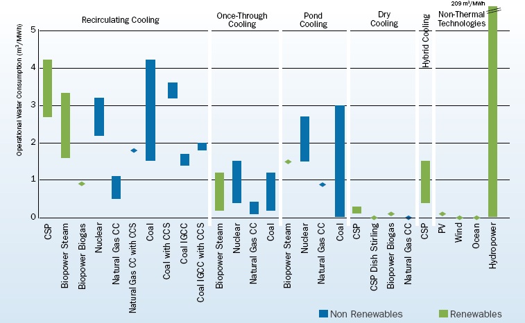 S druge strane plinske elektrane troše otprilike 0,7 metara kubi?nih po MWh, termoelektrane na ugljen 1,7 do 2 metara kubi?na po MWh, a nuklearne 2,7. Kao što je vidljivo na slici ispod, od obnovljivih izvora energije puno vode troše samo CSP elektrane (koncentrirane solarne elektrane koje rade sli?no kao termoelektrane) i biomasa, uz naravno hidroelektrane ?ija je cijela poanta koristiti vodu kao izvor energije.